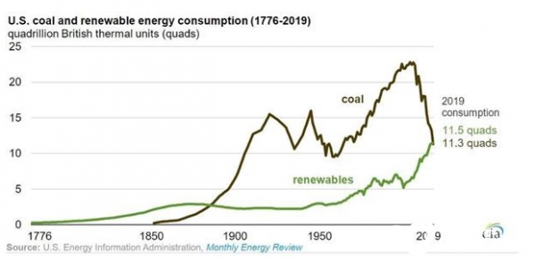 5月26日美國能源信息署(EIA)發(fā)布的《月度能源評論》顯示,2019年美國可再生能源消耗量自1885年以來首次超過煤炭,這比電力行業(yè)預(yù)測實(shí)現(xiàn)這一里程碑的時(shí)間還要早上一年。主要原因是過去十年來,由于廉價(jià)替代能源的崛起,煤炭的消耗量大幅下降。但在能源結(jié)構(gòu)中,可再生能源仍然遠(yuǎn)遠(yuǎn)落后于石油和天然氣等化石燃料,如果沒有頁巖氣繁榮帶來的廉價(jià)天然氣,美國的煤炭消費(fèi)可能仍將大大高于可再生能源消費(fèi)。